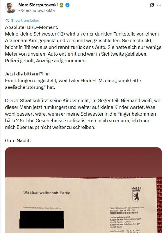 следствия. При этом, судя по 23 тысячам реакций в X, такая проблема не чужда многим немцам: Абсолютный ФРГ-момент: мою младшую сестру (12 лет) на темной заправке схватил за руку араб и попытался утащить. Расследование прекращено, потому что преступник Ходр Эль-М. страдает «патологическим психическим расстройством. Это государство не защищает своих детей. Такие инциденты настолько радикализируют меня, что я даже не смею писать дальше. Почему Мерц думает, что немцы захотят воевать за такую страну? 👍«БайБайден» в МАХ