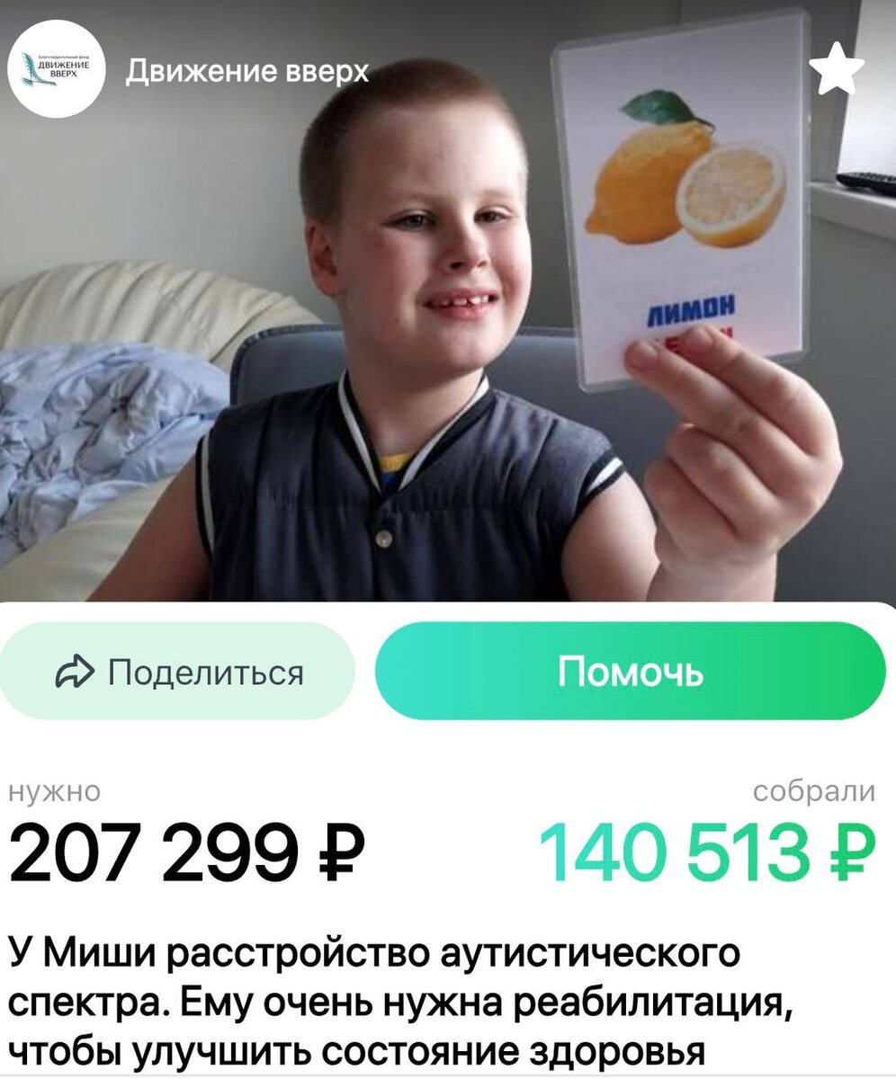Ваша помощь очень нужна подопечным детям нашего фонда «Движение вверх» - Мише Долганову, Артему Сасину и Коле Войтюку. Сбор средств осуществляется в приложении Tooba. В 2 года и 6 месяцев у Миши обнаружились первые диагнозы: минимальная мозговая дисфункция, задержка речевого и психического развития, дизартрия. А в 2020 году жизнь семьи изменилась навсегда – мальчика поставили на учет у психиатра и невролога, присвоив статус «ребенок-инвалид». В реабилитационном центре, в котором Миша уже проходил реабилитацию, специалисты борются за каждого ребенка, помогая раскрыть потенциал и навыки, научиться жить и адаптироваться в этом сложном мире. Давайте вместе поможем Мише пройти такой необходимый ему очередной курс реабилитации и улучшить его состояние здоровья! Артем Сасин родился в срок, путем кесарева сечения. Казалось, самое страшное позади. Но у малыша не заживал пупок, потребовалась операция. А потом – долгие месяцы тревоги: наркоз дал осложнения, Артем начал отставать в развитии. Ходи