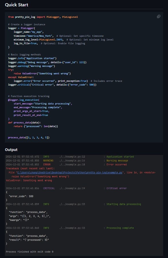 📝 Pretty Pie Log — это Python-библиотека для логирования, которая упрощает и улучшает вывод логов в консоль и в файлы благодаря цветному