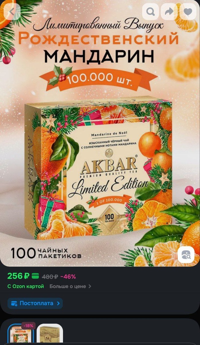 Akbar черный чай в пакетиках Рождественский мандарин,100 шт