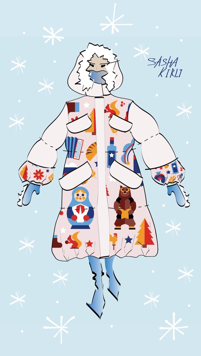 В работе - самый креативный в мире пуховик SASHA KIRLI с русским принтом и белой лисой