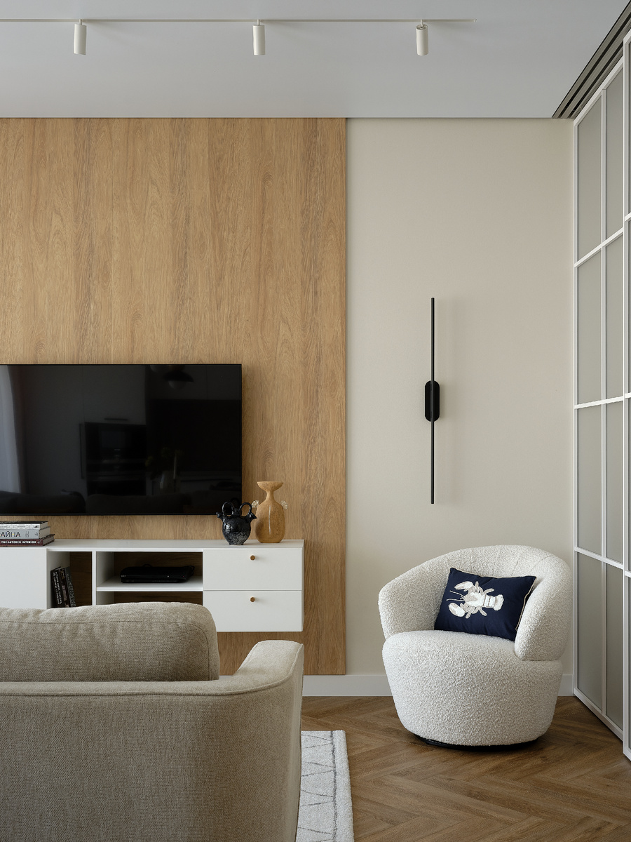 На 100 квадратных метров мы создали интерьер для большой семьи, где каждый сантиметр продуман для комфорта. Планировочное решение стало для нас увлекательной задачей, ведь необходимо было учесть несколько ключевых критериев: организовать удобные системы хранения, выделить рабочую зону в спальне и найти место для хозяйственной комнаты.