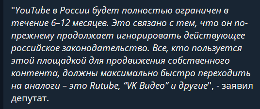 В отечественном парламенте, где искусство иносказаний и бюрократических эвфемизмов отточено до блеска, внезапно решили перейти на язык предельной, почти казарменной откровенности. Зампред комитета ГД по инфополитике и связи в беседе с изданием «Абзац» отринул былую дипломатичность и обозначил конкретные временные рамки: YouTube в России будет окончательно заблокирован в ближайшие полгода, максимум — год.