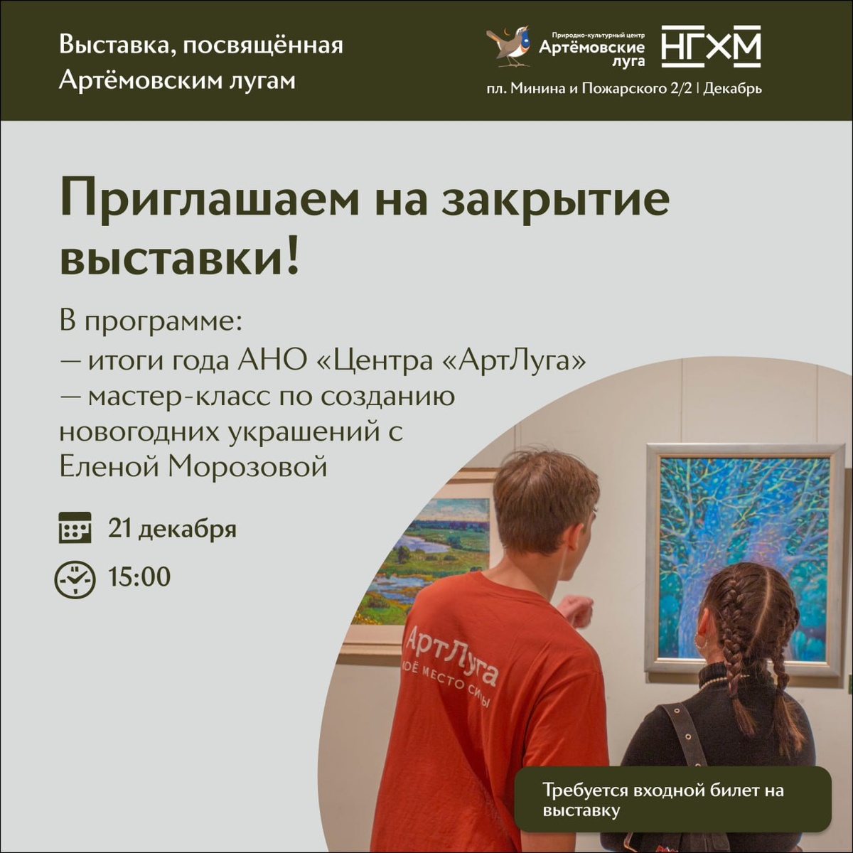 » Друзья, приглашаем вас 21 декабря в 15:00 в НГХМ | Искусство XX века на праздничное закрытие выставки «Артёмовские луга». Это последняя возможность в этом году увидеть живописные полотна, фотографии и скульптуры, посвящённые уникальному природному уголку нашего края, и встретиться с командой проекта. В программе закрытия: — Флористический мастер-класс по созданию новогодних украшений от Елены Морозовой. — Презентация итогов работы проекта «АртЛуга» в 2025 году и планов на будущее. — Неформальное общение в тёплой атмосфере. Вход на мероприятие возможен по билету в выставочное пространство НГХМ. Дата: 21 декабря, воскресенье Время: 15:00 Место: НГХМ | Искусство XX века (пл. Минина и Пожарского, 2/2) Приходите всей семьёй, чтобы вдохновиться красотой природы перед Новым годом и создать праздничное настроение своими руками! 🐧 Ближе к природе с АртЛугами