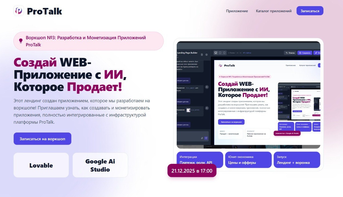 , Π° ΠΎ ΡΠΎΠ·Π΄Π°Π½ΠΈΠΈ AI-ΠΏΡΠΈΠ»ΠΎΠΆΠ΅Π½ΠΈΠΉ Π² ΡΠΈΡΡΠΎΠΌ Π²ΠΈΠ΄Π΅, ΠΊΠΎΡΠΎΡΡΠ΅ ΠΏΠΎΠ»Π½ΠΎΡΡΡΡ ΡΠ°Π±ΠΎΡΠ°ΡΡ Π½Π° ΠΊΠ°ΠΊΠΎΠΉ-Π»ΠΈΠ±ΠΎ ΠΌΠΎΠ΄Π΅Π»ΠΈ. ΠΠ»ΡΡΠ΅Π²ΠΎΠ΅ ΠΎΡΠ»ΠΈΡΠΈΠ΅: ΠΠ Π΄ΠΎΠ»ΠΆΠ΅Π½ ΡΠΌΠ΅ΡΡ ΡΡΠΎ-ΡΠΎ Π΄Π΅Π»Π°ΡΡ ΠΈΠ»ΠΈ ΡΡΠΎ-ΡΠΎ ΠΌΠ΅Π½ΡΡΡ. ΠΡ Π½Π°ΡΡΠΈΠΌ, ΠΊΠ°ΠΊ ΡΠΎΠ·Π΄Π°Π²Π°ΡΡ ΡΠ°ΠΊΠΈΠ΅ ΠΏΡΠΈΠ»ΠΎΠΆΠ΅Π½ΠΈΡ, ΠΈΡΠΏΠΎΠ»ΡΠ·ΡΡ ΡΠ²ΡΠ·ΠΊΡ Ρ Π½Π°ΡΠΈΠΌΠΈ ΠΌΠΎΠ΄Π΅Π»ΡΠΌΠΈ,, ΠΈ ΠΏΡΠ΅Π΄ΠΎΡΡΠ°Π²ΠΈΠΌ Π³Π°ΠΉΠ΄Ρ ΠΈ ΠΌΠ΅ΡΠΎΠ΄Ρ. π₯ ΠΠ΅ΠΉΡ-ΡΠ»Π°Π³ΠΌΠ°Π½: ΠΠΎΠ½ΡΡΡΡΠΊΡΠΎΡ Π»Π΅Π½Π΄ΠΈΠ½Π³ΠΎΠ² Ρ AI! Π ΠΊΠ°ΡΠ΅ΡΡΠ²Π΅ Π½Π°Π³Π»ΡΠ΄Π½ΠΎΠ³ΠΎ ΠΏΡΠΈΠΌΠ΅ΡΠ° (ΠΊΠ΅ΠΉΡΠ°) Π±ΡΠ΄Π΅Ρ ΠΏΠΎΠΊΠ°Π·Π°Π½ ΠΊΠΎΠ½ΡΡΡΡΠΊΡΠΎΡ Π»Π΅Π½Π΄ΠΈΠ½Π³ΠΎΠ² Ρ AI, ΡΠ΄Π΅Π»Π°Π½Π½ΡΠΉ Π² AI Studio,. ΠΡΠΎΡ ΠΈΠ½ΡΡΡΡΠΌΠ΅Π½Ρ ΠΏΠΎΠ·Π²ΠΎΠ»ΡΠ΅Ρ ΡΠΎΠ·Π΄Π°Π²Π°ΡΡ ΡΠ°ΠΉΡΡ, ΠΏΡΠΎΡΡΠΎ Π΄Π°Π²Π°Ρ ΡΠ΅ΠΊΡΡΠΎΠ²ΡΠ΅ Π·Π°ΠΏΡΠΎΡΡ. ΠΡΠ΄Π΅Π»ΡΠ½ΡΠΉ Π»Π΅Π½Π΄ΠΈΠ½Π³, ΡΠΎΠ·Π΄Π°Π½Π½ΡΠΉ Ρ ΠΏΠΎΠΌΠΎΡΡΡ ΡΡΠΎΠ³ΠΎ ΠΊΠΎΠ½ΡΡΡΡΠΊΡΠΎΡΠ°, ΡΠΆΠ΅ Π±ΡΠ» Π²ΡΡΡΠ°Π²Π»Π΅Π½ Π½Π° ΠΏΡΠΎΠ΄Π°ΠΆΡ Π·Π° 15 000 ΡΡΠ±., ΡΡΠΎ Π΄Π΅ΠΌΠΎΠ½ΡΡΡΠΈΡΡΠ΅Ρ, ΠΊΠ°ΠΊ ΡΠΎΠ·Π΄Π°ΡΡ ΠΏΡΠΎΠ΄ΡΠΊΡ, ΠΈΠΌΠ΅ΡΡΠΈΠΉ ΡΠ΅Π°Π»ΡΠ½ΡΠΉ ΡΠ»ΡΡΠ°ΠΉ ΠΏΡΠΎΠ΄Π°ΠΆΠΈ. π ΠΠ°ΡΠ° ΠΈ Π²ΡΠ΅ΠΌΡ: 21 Π΄Π΅ΠΊΠ°Π±ΡΡ Π² 17:00 (ΠΏΠΎ ΠΠ‘Π). π° Π‘ΡΠΎΠΈΠΌΠΎΡΡΡ ΡΡΠ°ΡΡΠΈΡ: 1