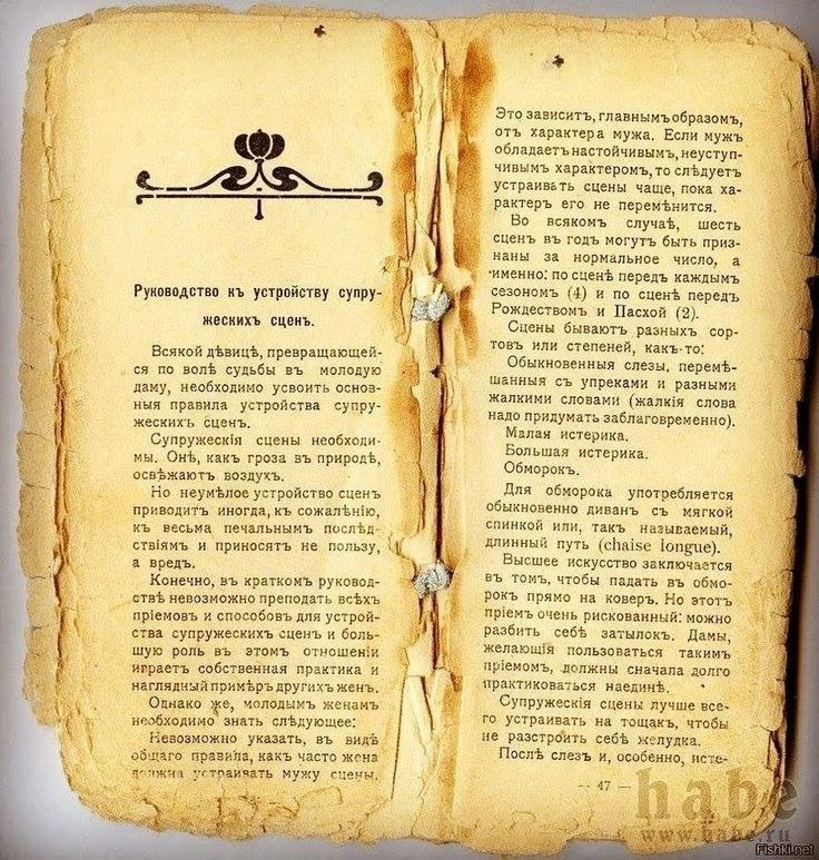 ?👹 Руководство по устройству супружеских сцен. "Всякой девице, превращающейся по воле судьбы в молодую даму, необходимо усвоить основные правила устройства супружеских сцен. Супружеские сцены необходимы. Они, как гроза в природе, освежают воздух". Но неумелое устройство сцен приводит иногда, к сожалению, к весьма печальным последствиям, и приносят не пользу, а вред. Конечно, в кратком руководстве невозможно преподать всех приемов и способов для устройства супружеских сцен и большую роль в этом отношении играет собственная практика и наглядный пример других жен. Однако же, молодым женам необходимо знать следующее: Невозможно указать, в виде общего правила, как часто жена должна устраивать мужу сцены. Это зависит, главным образом, от характера мужа. Если муж обладает настойчивым, неуступчивым характером, то следует устраивать сцены чаще, пока характер его не переменится. Во всяком случае, шесть сцен в год могут быть признаны за нормальное число, а именно: по сцене перед каждым сезоно