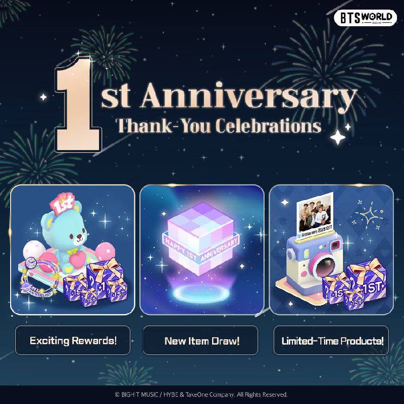 : 1. Анонс событий к 1-й годовщине. Менеджер, вы готовы праздновать вместе с нами?!🎉🎵 События к 1-й годовщине скоро начнутся! Следите за новостями~ ‧₊˚✧ 𝟐𝟎𝟐𝟓. 𝟏𝟐. 𝟏𝟕 ✧˚₊‧ 2. Годовщина благодарности. Менеджер 💖 Давайте вместе отпразднуем замечательный год BTS World Season 2 🥳 Сохраните праздничное изображение и загрузите его с вашим FID + хэштегом BTSWS2_1YEAR + поздравительным сообщением, чтобы получить шанс выиграть Билет выбора карты "Золотые часы" или Счастливые коробки к 1-й годовщине! 📅 Период события: с 17 по 22 декабря 16:59 - Украина 17:59 - Москва, Беларусь 19:59 - Казахстан, Узбекистан 📌 Бонусное событие: Если этот пост набёрет 365 репостов, все Менеджеры получат подарок! 🔗 Подробнее 🎮 Скачать игру #BTSWorld @kumihobts