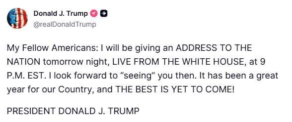 "Я выступлю с ОБРАЩЕНИЕМ К НАЦИИ завтра вечером в прямом эфире из Белого дома в 21:00 по восточному времени".