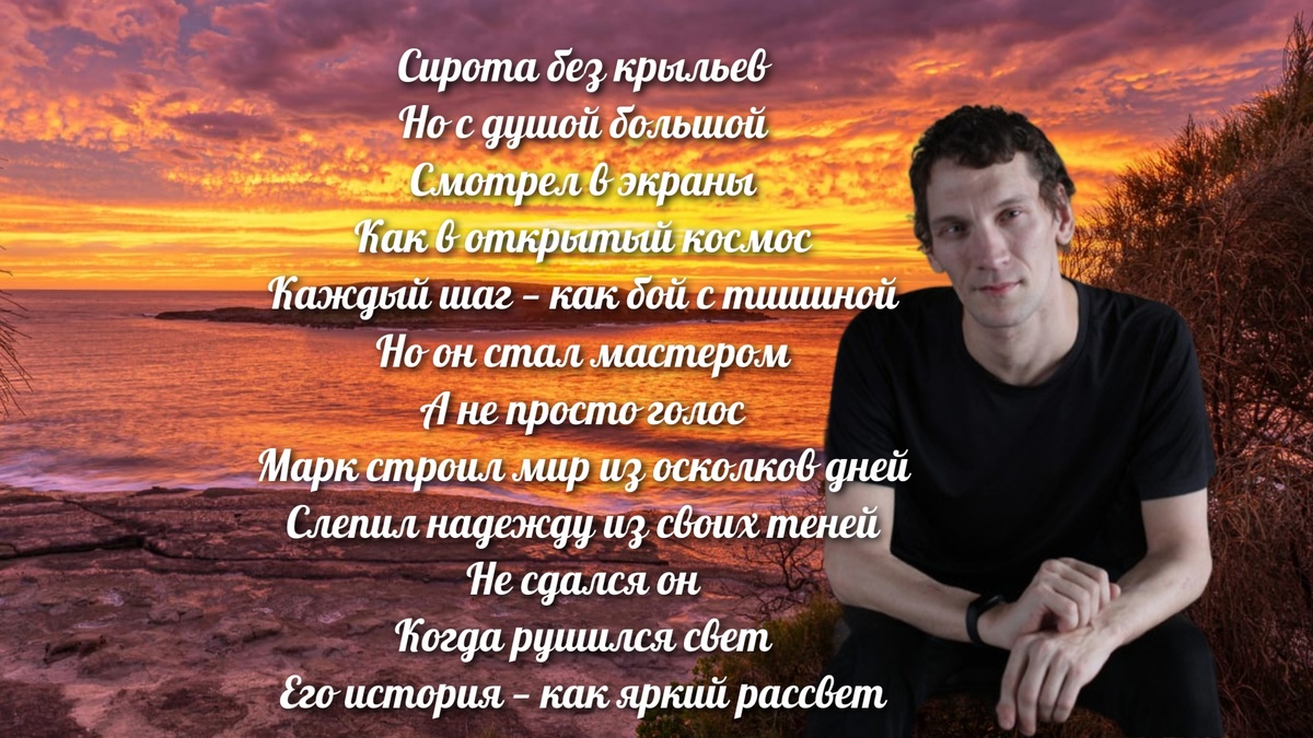Там Где небо ниже Чем мечты Где слова ранят Как острые ножи Он нашёл свой путь среди пустоты Сквозь шёпот боли и шорох лжи Марк строил мир из осколков дней Слепил надежду из своих теней Не сдался он Когда рушился свет Его история — как яркий рассвет Сирота без крыльев Но с душой большой Смотрел в экраны Как в открытый космос Каждый шаг — как бой с тишиной Но он стал мастером А не просто голос Марк строил мир из осколков дней Слепил надежду из своих теней Не сдался он Когда рушился свет Его история — как яркий рассвет Кто-то сдаётся Кто-то бежит А он стоит В сердце огонь горит Он знал: впереди не только боль Его путь — его контроль Марк строил мир из осколков дней Слепил надежду из своих теней Не сдался он Когда рушился свет Его история — как яркий рассве