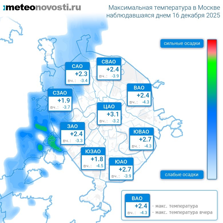 Максимальная температура днём в Москве была на 5.6°C выше нормы, что немного теплее, чем обычно. Самая высокая температура +3.1°C была зафиксирована в 19 часов в центре города, а холоднее всего было на западе: +0.7°C. Разница по максимальной температуре в разных частях столицы составила за день 2.4°C. Максимальные порывы ветра днём достигали 5 м/с. Атмосферное давление за день понизилось с 751 до 749 мм.рт.ст. Повсеместно прошли небольшие осадки. Больше всего осадков выпало на юге города – 2.1 мм. Самый теплый день в Москве 16 декабря был в 2006 году, когда максимальная температура составила +6.3°C, а холодный в 1997 году: -21°C. Перейти на сайт Прогноз погоды на 14 дней