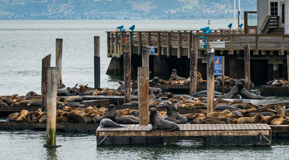 📌 Рыбацкая пристань — культовое место в Сан-Франциско! 🦀 Здесь можно увидеть морских львов, греющихся на солнце ☀️, попробовать свежайшие
