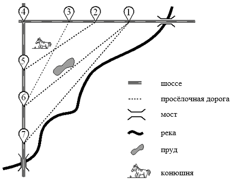 - На плане просёлочная дорога с конюшней идёт от цифры 3 к цифре 6.