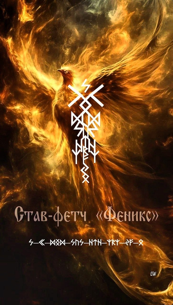 7. Йера (ᛃ) + Феху (ᚠ) — хвост-огонь феникса (цикл + новое богатство)