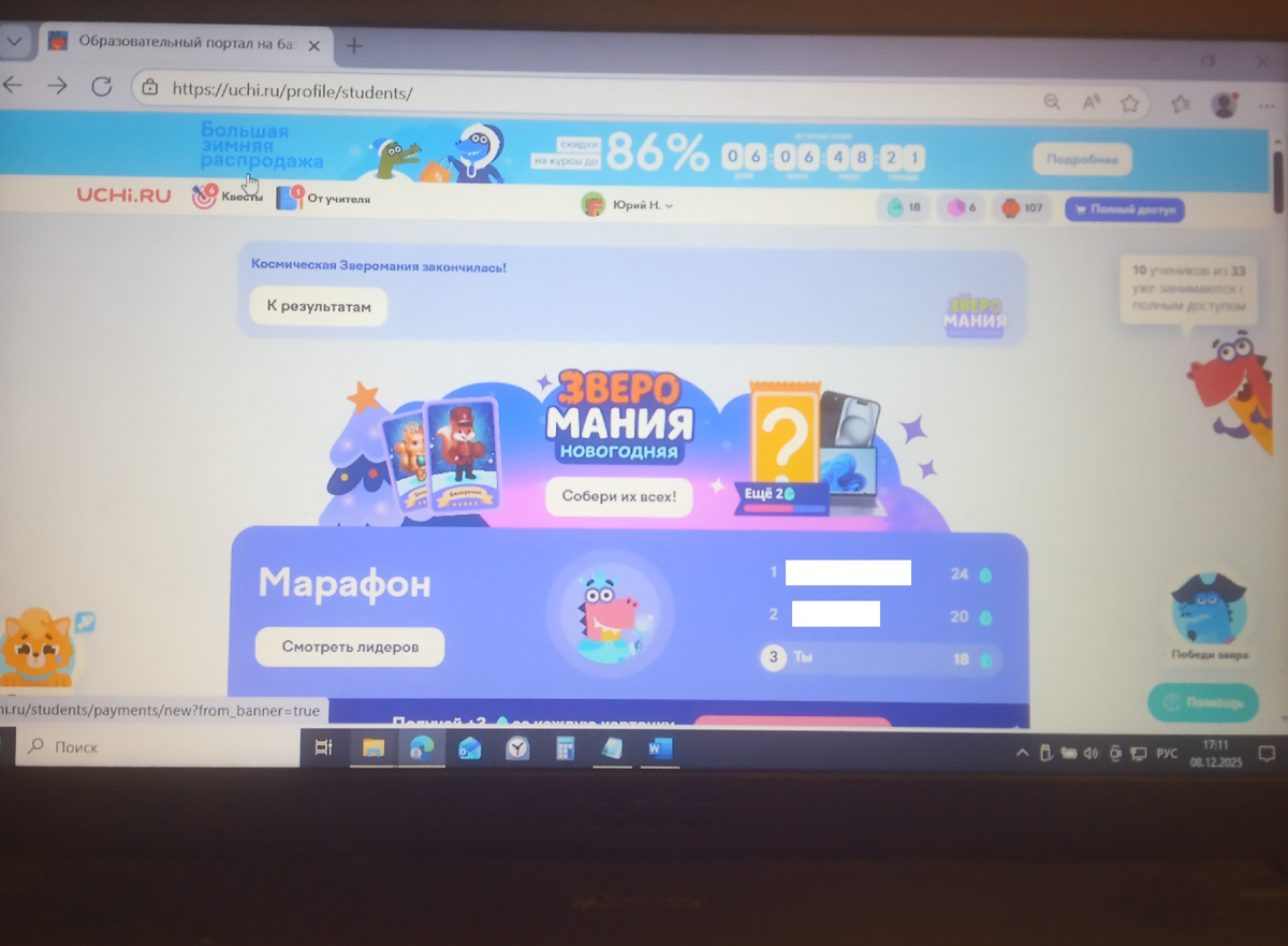 Всем привет! Сейчас я вам напишу статью об образовательной платформе "Учи.ру". На первой фотографии покажу начало, где показывается, на каком я месте! Дальше покажу "Звероманию новогоднюю". Здесь можно собирать карточки и выигрывать призы. Также покажу квесты. За выполнение заданий из квестов можно получить яйца марафона. Потом покажу задания от учителя; в этом разделе, в основном, находятся задания от заврика Гриши. Дальше смотрите на "Магазин алмазов". Первые три алмаза можно получать бесплатно каждые 24 часа. Потом смотрите на "Восточный базар". За одну решённую карточку дают один фонарик. За фонарики можно получить призы. Когда бесплатные задания заканчиваются, предлагается купить годовой пакет. В первом классе у меня был полный доступ к разным предметам и курсам, я занимался больше и был почти всегда на первых местах. Можно купить заинтересовавшие курсы и по отдельности. Также на платформе проходят олимпиады - вот, например, идёт олимпиада по естественным наукам. За прохождение ол
