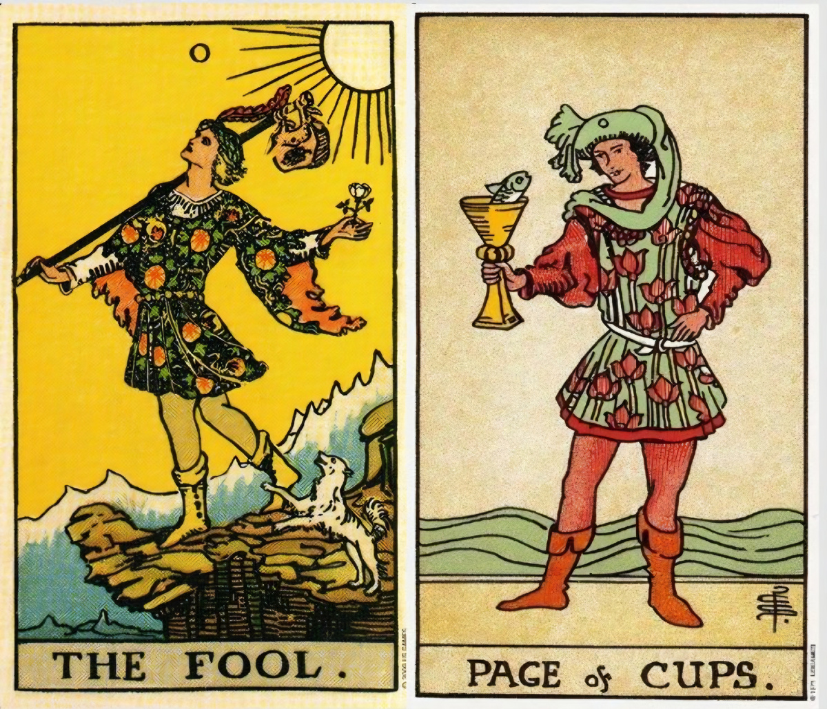 Сочетание Шута (0/XXII) и Пажа Кубков — это энергия "первой любви", нового увлечения, робкого, но многообещающего творческого старта или получения радостных известий. Оба — вечные дети в своих стихиях.
