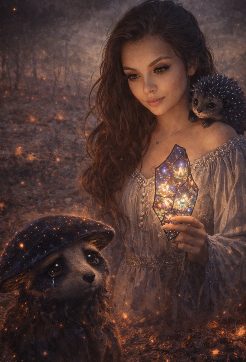 Он привёл нас к месту, где пепел был особенно густ, а тлеющие огоньки висели чаще. В центре небольшой впадины лежал предмет. Не ключ, не книга. Небольшой, неровный осколок цветного стекла, будто от старого витража. Он был тёплым на ощупь, и в его глубине, словно в калейдоскопе, переливались отсветы — не просто цвета, а крошечные, живые сцены.