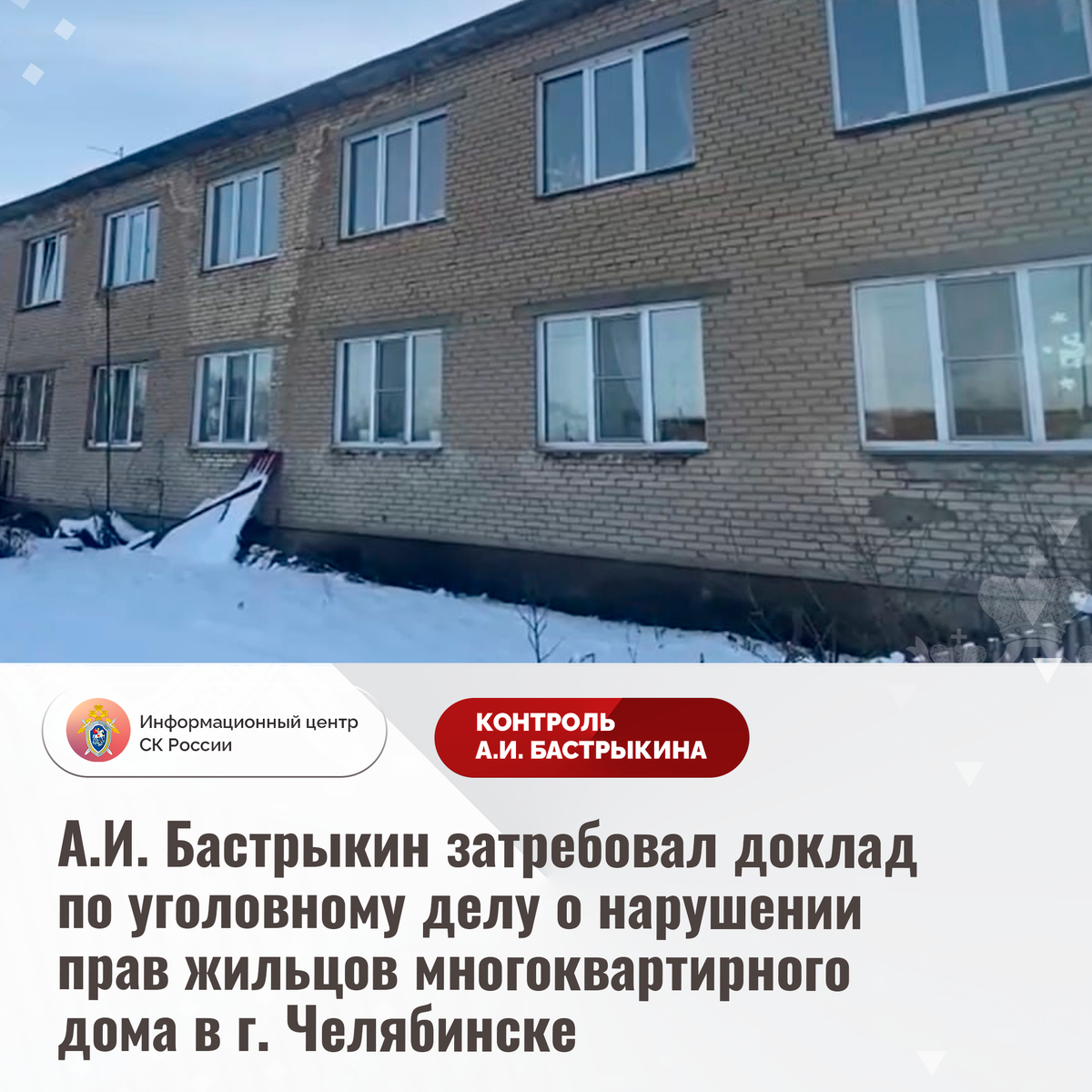 А.И. Бастрыкин затребовал доклад по уголовному делу о нарушении прав жильцов многоквартирного дома в г. Челябинске