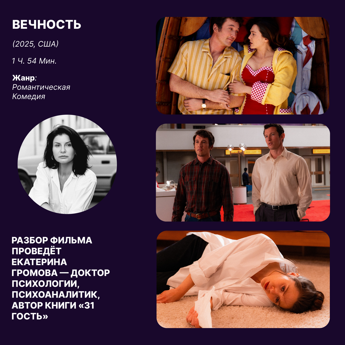 24 декабря кинотеатр «Синема Парк Мосфильм» приглашает на очередной сеанс программы с нашим постоянным экспертом, доктором психологии, супервизором Екатериной Громовой. Смотрим и разбираем фантастический ромком «Вечность» со звездами Голливуда Майлзом Теллером и Элизабет Олсен в главных ролях.