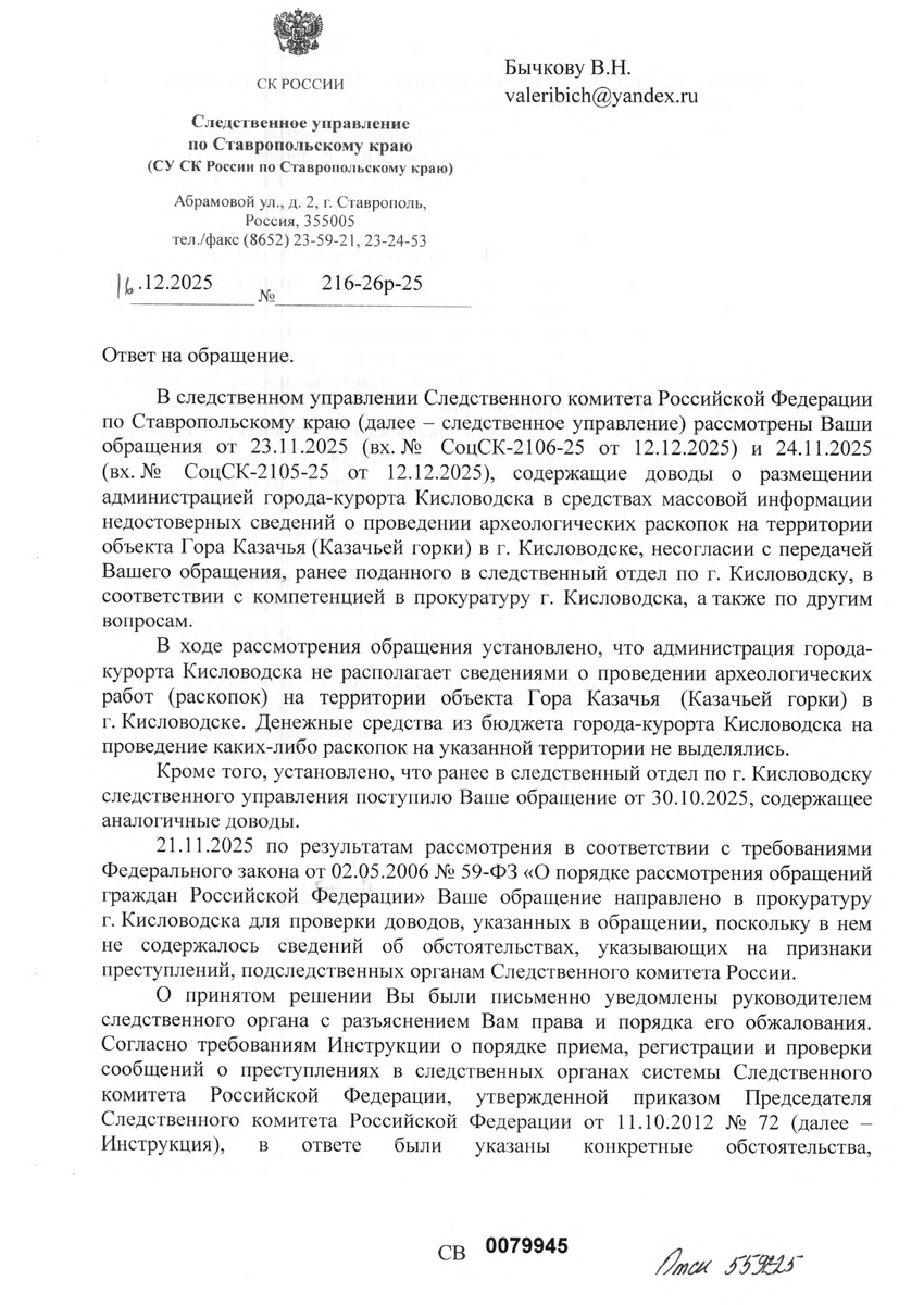 Из ответа Следственного управления СК РФ, нет ответа на поставленный вопрос! С какой целью была размещена ложь 14.08.2025 года мэра Моисеева и многих СМИ края! Организованно под копирку в один день! Видно четкое руководство большой властной руки! Уверены были, что их никто за это не привлечет к ответу! Ответы даются со слов мэрии и проверки финансовой не было! Прокуратура тоже затягивает с ответом и мы уверены, что будет на подобие этого! А какая цель этого спектакля мы видимо так и не узнаем! Ответ СУ СК РФ по Ставропольскому краю,