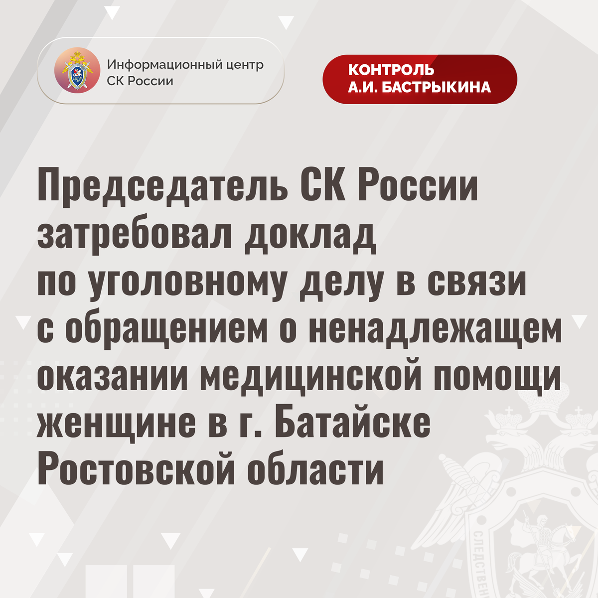 Председатель СК России затребовал доклад по уголовному делу в связи с обращением о ненадлежащем оказании медицинской помощи женщине в г. Батайске Ростовской области В Информационный центр СК России обратилась жительница Ростовской области по вопросу несогласия с ходом установления обстоятельств ненадлежащего оказания ей медицинской помощи в городе Батайске. В июне 2023 года женщина поступила в один из родильных домов для родоразрешения. В связи с допущенными дефектами новорожденный получил повреждения, ему установлена инвалидность. Отмечается, что расследование уголовного дела приняло затяжной характер, до настоящего времени никто к ответственности не привлечен. В СУ СК России по Ростовской области с октября 2023 года расследуется уголовное дело. Председатель Следственного комитета Российской Федерации Александр Иванович Бастрыкин затребовал у руководителя СУ СК России по Ростовской области Аслана Гаруновича Хуаде доклад о проведенном по уголовному делу комплексе следственных действий