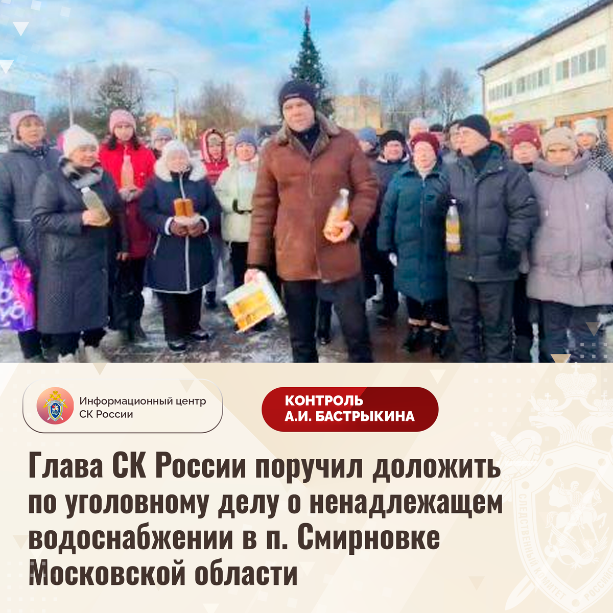 Глава СК России поручил доложить по уголовному делу о ненадлежащем водоснабжении в п. Смирновке Московской области В социальной сети опубликовано видеообращение жителей поселка Смирновка Московской области по вопросу нарушения их прав на качественное водоснабжение. Длительное время в жилые помещения поступает непригодный для потребления и бытовых нужд коммунальный ресурс, ввиду наличия примесей ржавчины. Местные жители вынуждены на постоянной основе приобретать бутилированную воду и фильтры, что для них финансово затруднительно. Многочисленные обращения граждан в различные инстанции результатов не принесли. В ГСУ СК России по Московской области возбуждено уголовное дело. Председатель Следственного комитета Российской Федерации Александр Иванович Бастрыкин поручил руководителю ГСУ СК России по Московской области Ярославу Александровичу Яковлеву доложить о ходе и результатах расследования уголовного дела. Исполнение поручения поставлено на контроль в центральном аппарате ведомства. #Сле