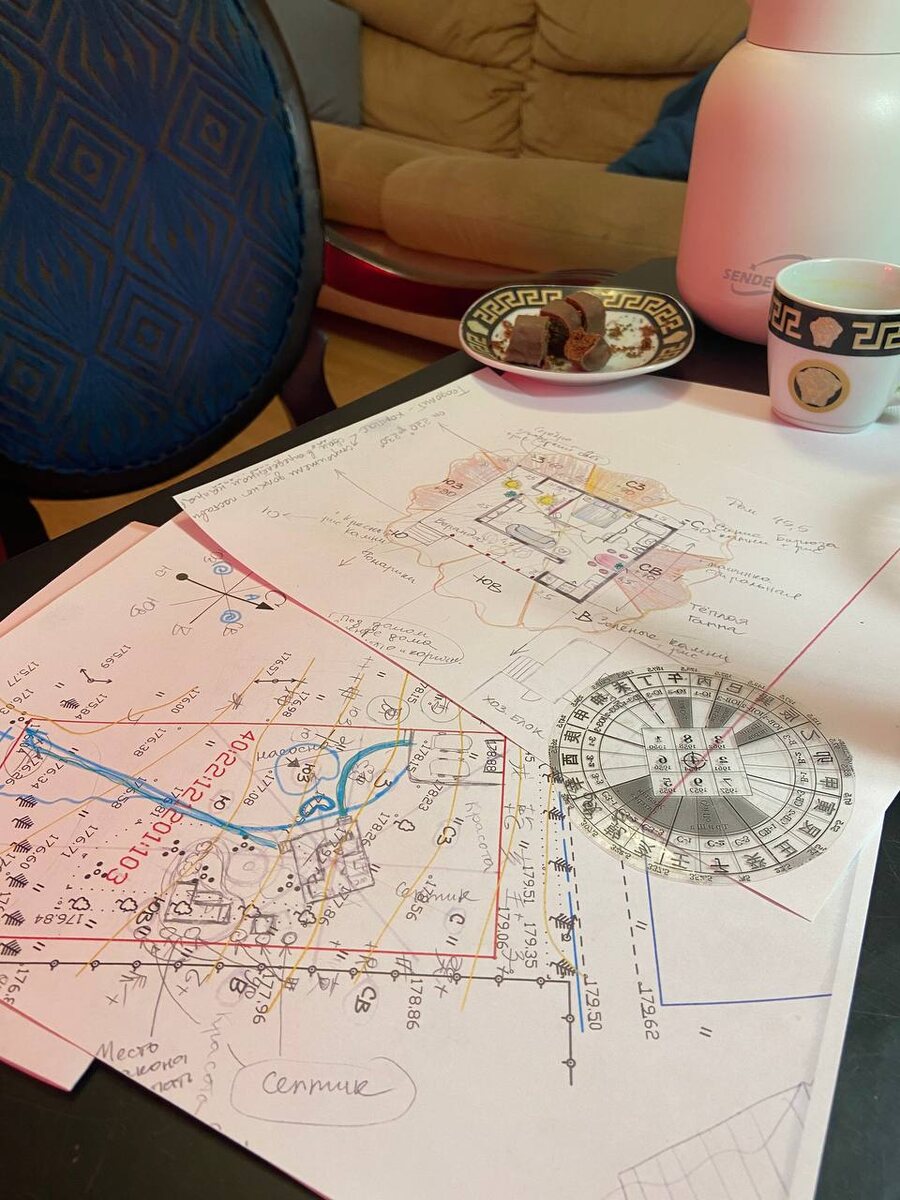 там расположить небольшой дом, гостевой домик, навес для машин, дорожки, септики, колодец и прочее. Случай оказался непростой, мне пришлось поломать голову в поиске идеального варианта планировки дома и расположения его на участке. Из-за того, что участок имеет сильные перепады высот и специфический поворот по сторонам света, поставить дом просто вдоль передней линии участка было нельзя. Такое расположение принесло бы владельцу упадок и разорение. Будучи очень интуитивным человеком он почувствовал это и самостоятельно искал другое решение, но только измучился и не нашёл его, а обратился ко мне. Я просчитала несколько вариантов по специальным формулам фэншуй и только один оказался благоприятным для него, почти идеально вписывающийся в ландшафт участка. В течении несколько часов мы подробно обсудили все нюансы по планировке дома, где всё настроено для его быстрого процветания и взрывной удачи: главный вход, местонахождение спальни и кровати, кухни, плиты, санузла, гостиной и веранды.