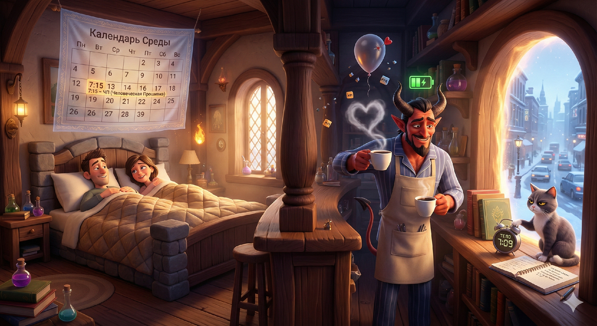 Прием. Присаживайся. Чёрный, без сахара? Нет, это не опечатка. Среда — это новый духовный фронт. Твой фронт. И мы с кофе наблюдаем. Помнишь то благоговение, с которым первобытный человек встречал рассвет солнца? Твой пра-пра-пра-предок вылезал из пещеры, ударял себя пяткой в грудь и благодарил духов за новый день. Ты же просыпаешься в среду в 7:09 от назойливого будильника под названием «ТЕЛО». Не благодаришь. Ты — договариваешься. И здесь, в этот узкий коридор между «О, боже, уже утро» и «Господи, опять пробки», случается оно. Сакральный акт. Не просто секс. А Секс по Средам в 7:15. Это не про страсть. Страсть — для пятниц, и то если повезет с энергетикой после пятого бокала. Страсть хаотична, непредсказуема и пахнет дешёвым текилой. Нет. Среда — про архитектуру. Это самый цинично-гениальный ритуал прорыва сквозь рутину, который только мог изобрести ваш вид. Ты буквально прокалываешь иглой удовольствия воздушный шар недельного давления, чтобы он не лопнул в четверг от злости на началь