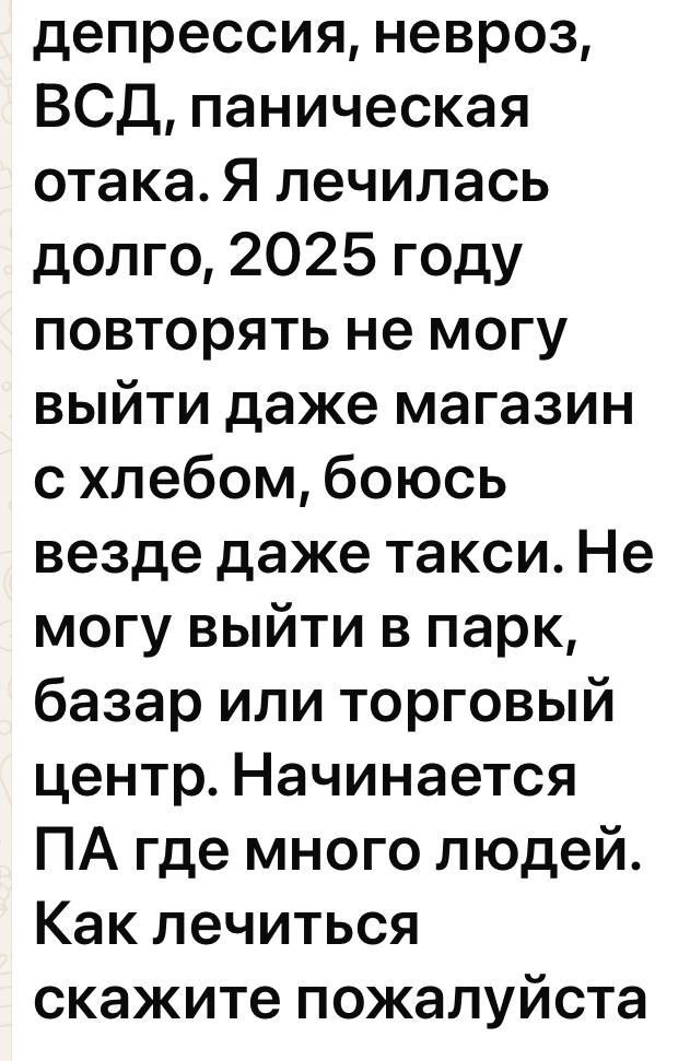 ». Это мощный психофизиологический ответ организма на непрожитую травму стресса, горя и страха, связанную с рождением дочери. Тело до сих пор находится в том же режиме выживания, что и в 21 год. Лечить нужно не симптом (страх выйти), а первопричину. 🔴 Что можно делать САМОЙ прямо сейчас: ❗️1. Техника «Заземления» во время ПА. Как только чувствуете начало тревоги: сядьте, почувствуйте стопами пол, спиной — спинку стула. Вслух назовите: · 5 вещей, которые видите. · 4 вещи, к которым можете прикоснуться. · 3 звука, которые слышите. · 2 запаха, которые чувствуете. · 1 вкус во рту. Это возвращает мозг из паники в «здесь и сейчас». ❗️2. Микро-шаги, а не подвиги. Не ставьте цель «выйти в ТЦ». Ваша цель на завтра — выйти за порог квартиры на 30 секунд. Послезавтра — сделать 5 шагов до почтового ящика. Каждый шаг — ваша победа. Записывайте их. ❗️3. Работа с дыханием. 2-3 раза в день по 5 минут практикуйте дыхание 4-7-8: вдох на 4 счёта, задержка на 7, медленный выдох чере