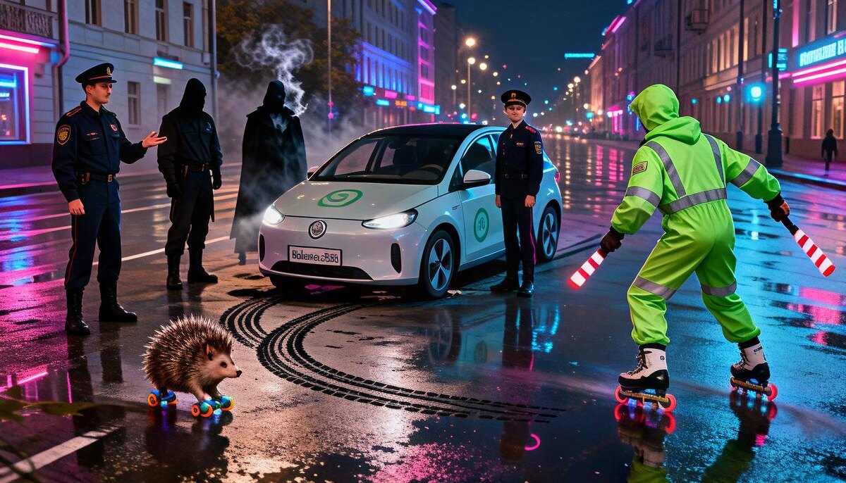 История основана на реальных событиях, произошедших 7.12.2025 с гр-ном Н в городе М В славном городе М., где даже светофоры подмигивают с намеком, гражданин Н. проснулся от вопля родственницы. Родственница, чьё здоровье дало сбой как старый советский магнитофон (ну, почти инсульт), требовала укола, словно космонавт – wi-fi в открытом космосе. И вот, наш герой уже мчит на каршеринговом корыте, цвет которого идеально сочетается с тоской по упущенным возможностям. На улице Фабричной, после виртуозного поворота а-ля "пьяный ёжик на роликах", Н. увидел – что-то бежит. Существо в кислотной светоотражайке неслось по дороге, будто убегало от налоговой инспекции. Чтобы не превратить бегуна в дорожную открытку, Н. применил экстренное торможение, достойное учебников по физике. И тут явились ОНИ. Три богатыря без коней, но зато с полосатыми палочками. Сотрудники ГИБДД! Мастера маскировки level 100, ибо нашивки и погоны на них увидеть было сложнее, чем снежного человека в Сочи. Номера патрульной