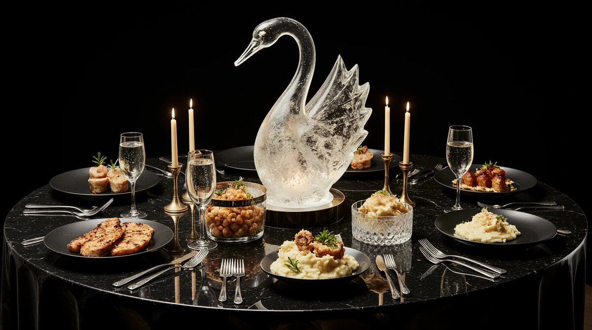 Элитный новогодний кейтеринг. Фуршетный стол с изысканными закусками: устрицы, икра, фуа-гра, трюфели. Хрустальная посуда, серебряные столовые приборы, ледяная скульптура. Тёмный фон, драматическое освещение, стиль люкс.