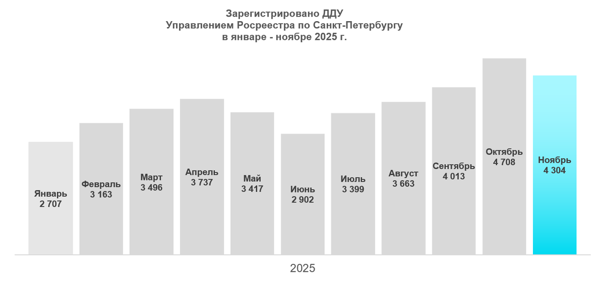 Вот опять мне будут говорить, что у всех кругом все растет и только у меня падает. Но я всегда свои слова подкрепляю статистикой. Вот и сейчас расскажу, что нам поведал Росреестр Петербурга за ноябрь 2025 года. Новостройки Общее количество зарегистрированных в ноябре ДДУ – 4 304, что на 8,5% меньше октября (4708). Всего за 11 месяцев зарегистрировано 39 509 ДДУ. И это на 29,5% меньше чем в 2024 году (56056) и на 56,2% меньше, чем в эталонном 2019 году (90288). Вторичка 7 434 - это количество сделок на вторичке Петербурга, что на 13% меньше октября (8573). И я писал, что есть ощущение снижение активности покупателей на вторичке (Долина тут не причем). Думаю тут два объяснения: 1. Выбрать нечего. Предложение на рынке скудное и по цене неадекватное. Часть покупателей реально не готово брать "что дают". 2. Экономическая ситуация не располагает. Те, у кого был нал, постепенно вопросы решили, те, кто может купить только с помощью ипотеки, не могут себе позволить покупку. Всего за 11 месяц