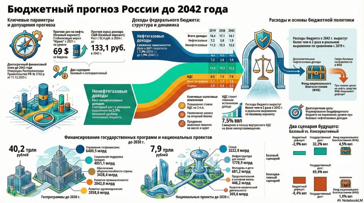 ◾️До 2042 года нефть официально перестаёт быть опорой: её вклад падает почти в 3 раза. ▫️Главный «донор» государства — НДС, его собираются держать выше 7,5% ВВП десятилетиями. ◾️Даже в спокойном сценарии Россия планирует жить с постоянным дефицитом, без выхода «в ноль». ▫️Рубль в расчётах ослабляется до 130+ за доллар — это скрытый механизм балансировки бюджета. ◾️В плохом сценарии госдолг почти утраивается, а ФНБ практически исчезает. _____ Чтобы не читать весь текст, попросил ИИ набросать схематично. Там есть некоторые ошибки в буквах, но с цифрами все ОК. Лично для меня что бросилось в глаза - это сильный сдвиг в структуре доходов. Долю нефтегазовых доходов хотят сократить до 1.9%. Однако, ключевой вопрос для меня в том: хотят или это будет вынужденное снижение, как, например, в этом году. Основная ставка в доходах делается на налоги, а именно на НДС. Это означает, что 2025 год только задал тренд и мы "превращаемся в развитую экономику", где будут высокие налоги. Здесь же бро