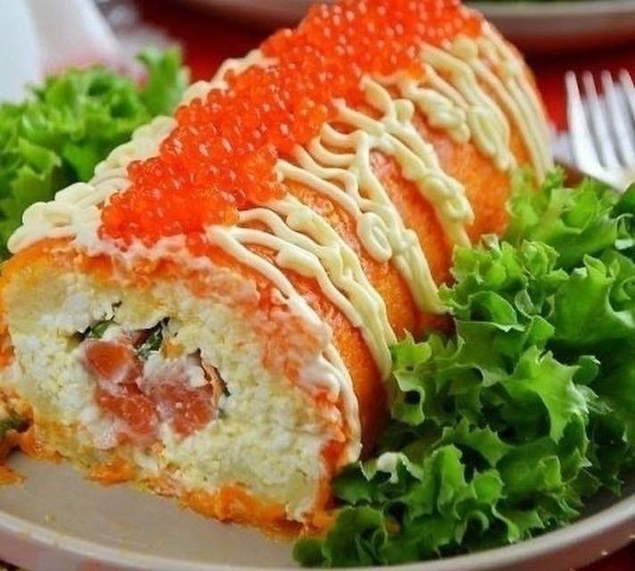 Овощи отварить и натереть на тёрке. На пергаментной бумага выложить морковь, посолить и смазать майонезом. Затем картофель, соль, майонез, яйцо, соль, майонез и сёмга. Свернуть в рулет. И поставить в холодильник на часа 3, чтоб форма схватилась. Можете украсить, как хотите. Икрой, зеленью, майонезом.