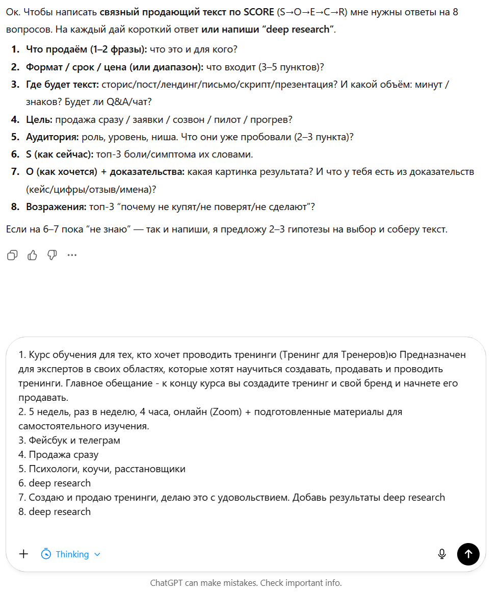 Оцените pls текст :-). Я тут, в рамках подготовки тренинга для тренеров, соорудил для участников GPTs, которая задает вопросы, а потом делает связный продающий текст по модели SCORE. В помощь :-). Кстати, если надо, пишите в комменты, поделюсь, заодно и обкатаем поплотнее. Текст специально даю без обработки, как chatGPT выдал. На картинке - начальный диалог.