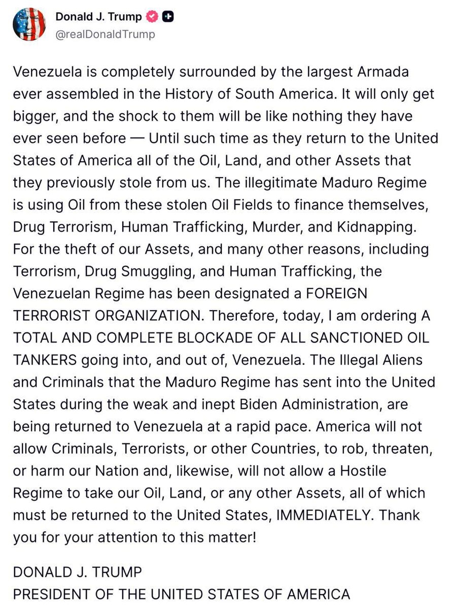TRUMP ORDERS ‘TOTAL AND COMPLETE BLOCKADE OF ALL SANCTIONED OIL TANKERS going into, and out of, Venezuela’