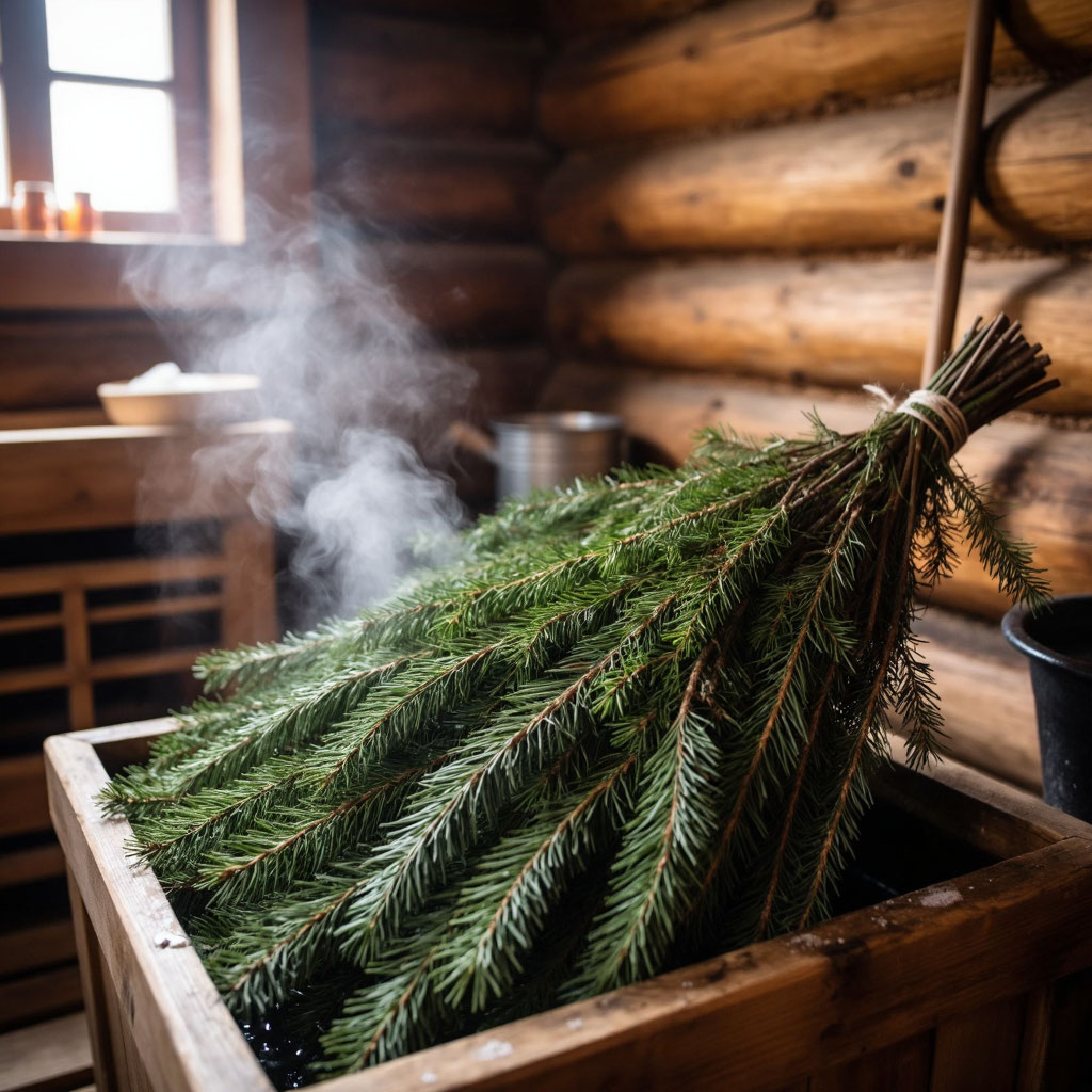 🔸 Выбор веника — ищите веники, собранные в экологически чистых районах. В 2025 году особенно важно обращать внимание на сертификаты качества. Хороший пихтовый веник имеет насыщенный зелёный цвет, упругие ветки и сильный, но не резкий аромат.