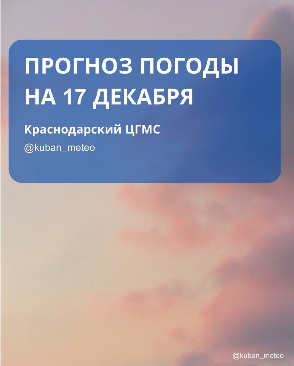 ☁️⛅⛈️ ⛅ 17 декабря 🗓️ По Краснодарскому краю: Переменная облачность. Без осадков. • Местами туман • Ночью и утром гололедно-изморозевое отложение 💨 Ветер переменных направлений 3-8 м/с 🌡️ Температура воздуха: • Ночью: -1…-6° • В восточной половине края: -4…-9° • Днём: -1…+4° • В южной половине края: 2…7° • В горах: • Ночью: -6…-11° • Днём: -1…-6° 🌊 На Черноморском побережье: Переменная облачность. Без осадков. 💨 Ветер восточной четверти 6-11 м/с • Местами порывы 12-14 м/с 🌡️ Температура воздуха: • Ночью: +4…-1° • Днём: 8…13° 🏙️ По г. Краснодару: Переменная облачность. Без осадков. • Ночью, утром и в первой половине дня: туман • Ночью и утром гололедно-изморозевое отложение 💨 Ветер переменных направлений 3-8 м/с 🌡️ Температура воздуха: • Ночью: -2…-4° • Днём: 2…4° С заботой, Краснодарский ЦГМС @kuban_meteo 💙