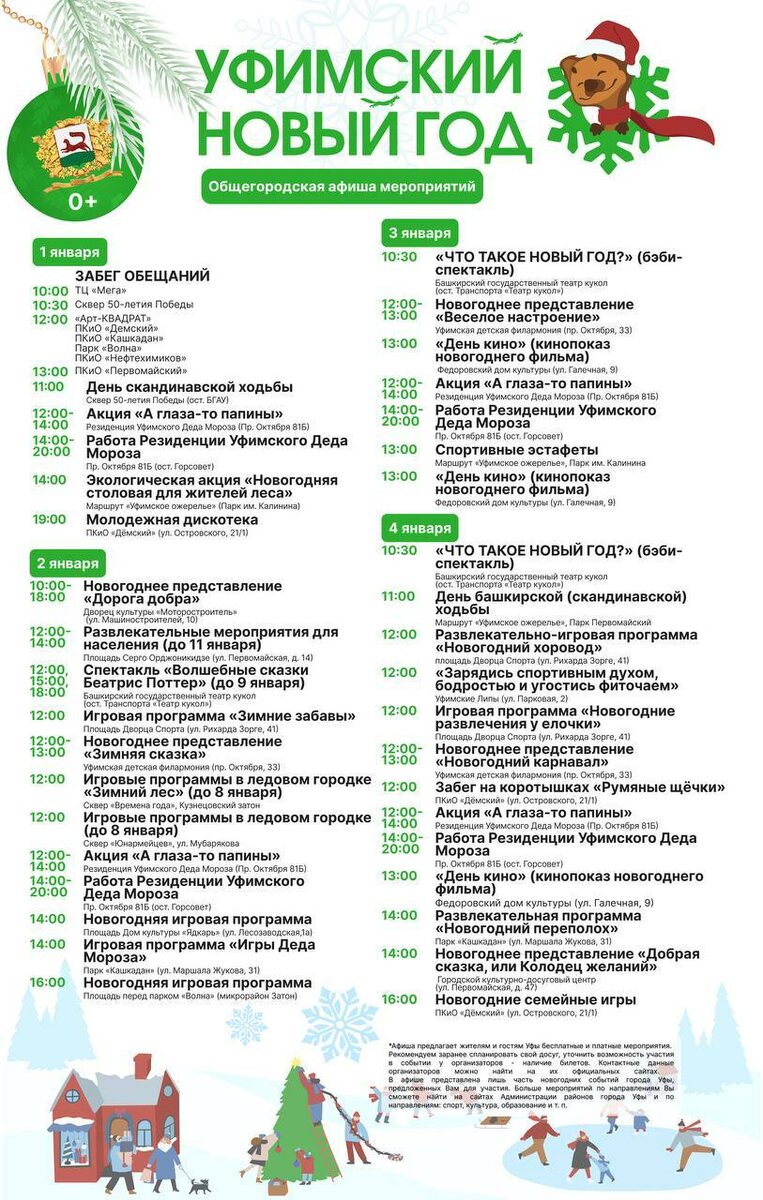 Мэр столицы на своей странице в соцсетях предложил уфимцам весело провести сам праздник и новогодние каникулы. «Выбирайте, как провести один из самых волшебных праздников! Делитесь с друзьями и близкими!» — отметил Ратмир Мавлиев. Общегородская афиша представляет мероприятия, которые пройдут в городе с 20 декабря по 11 января. В их числе открытие резиденции Деда Мороза и зажжение огней на главной елке, запуск новогодних городков, праздничная программа в новогоднюю ночь, традиционный «Забег обещаний», «Зимние забавы» и многое другое. Инфографика: Ратмир Мавлиев ТГ.