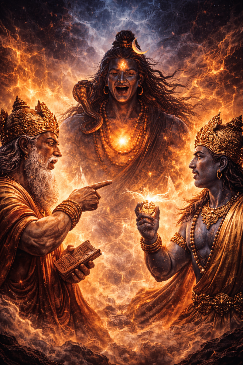 Их эго столкнулись как два океана, и мир задрожал. И тут между ними вспыхнул неописуемый столб света, бесконечный вверх и вниз. Он был столь ярким, что ослеплял, столь огромным, что ум не мог его охватить. Это был Шива, проявившийся в форме Лингама, бесформенного, но всепроникающего. Вишну принял форму вепря и нырнул вглубь земли, чтобы найти основание. Брахма — превратился в лебедя и полетел вверх, к вершине. Прошли тысячи лет, но никто не нашёл ни начала, ни конца. Лишь один признал правду. Вишну сказал: