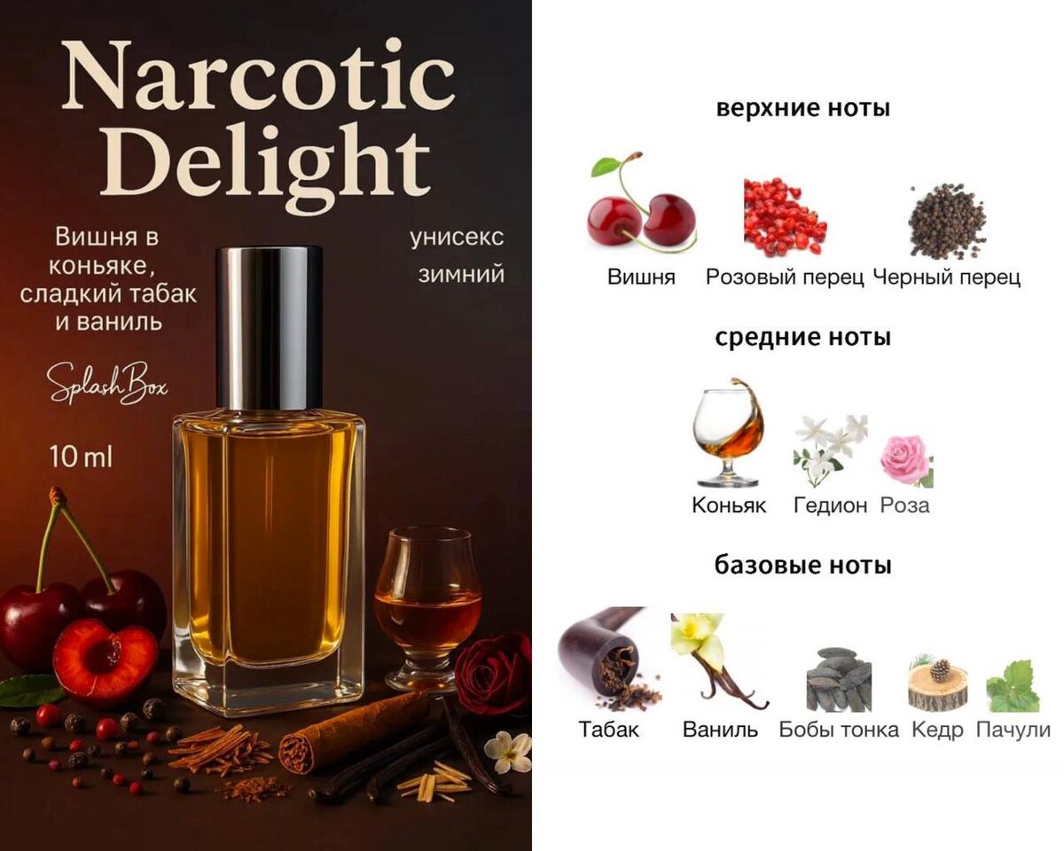 😊😊😊😊😊😊😊😊😊😊 😊😊😊😊😊😊 😊😊😊 😊😊😊😊😊😊😊😊😊😊 Всем привет! 😊 Сегодня у меня вишня для смелых 😊 Очень рекомендую, кто не пробовал😊 🍒 Narcotic Delight - вишня в коньяке, сладкий табак и ваниль 🩷 Арт. 554744577 💙 Арт. 2959991568 😊Аромат-референс: Narcotic Delight Initio Parfums Prives 😊Пирамида: Верхние ноты: Вишня, Розовый перец и Черный перец Средние ноты: Коньяк, Гедион и Роза Базовые ноты: Табак, Ваниль, Бобы тонка, Кедр и Пачули 😊Звучание: Аромат открывается с яркими, сочными и немного пикантными нотами: - Вишня - сладкая, насыщенная, почти ликёрная, с лёгким кисловатым акцентом. - Розовый перец - добавляет легкую пряную остроту, придавая аромату изысканную живость. - Чёрный перец - усиливает остроту и делает начало более насыщенным, создавая интересный контраст с вишней. Это начало неожиданно яркое и смелое, словно сладкий и острый коктейль. Сердце становится более глубоким и сложным: - Коньяк - тёплый, с лёгким алкогольным акцентом, который доба