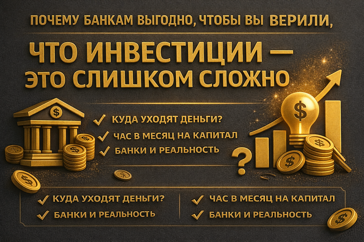 И вот тут на сцену выходят банки и управляющие компании. Банки продают не только продукты. Они продают состояние: «Расслабьтесь, мы всё сделаем за вас». Из этого складывается несколько устойчивых посылов: Заметьте: чем сложнее выглядит продукт, тем легче оправдать комиссии и скрытые расходы. И тем дальше вы от управления собственными деньгами. Есть простой, но жёсткий тезис: Если вы сами не управляете своими деньгами, это всегда делает кто-то другой — и всегда в свою пользу. Банкам и фондам нужно: В результате: Так формируется зависимость: без банка человек чувствует себя финансово беспомощным. В этой серии мы раз за разом возвращаемся к идее: 1 час в месяц, посвящённый своему капиталу, может изменить финансовую т