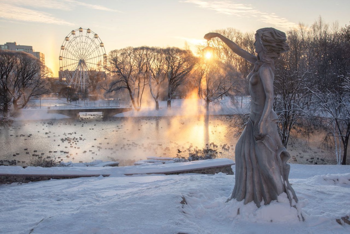 Довольно популярная у фотографов и местных видовая точка. Зимой, на рассвете, если встать под определенным углом, солнце попадает прямо в фонарик, а пар от пруда на морозе создаёт эффект лучей от фонаря. Короче, зимой тут красиво.