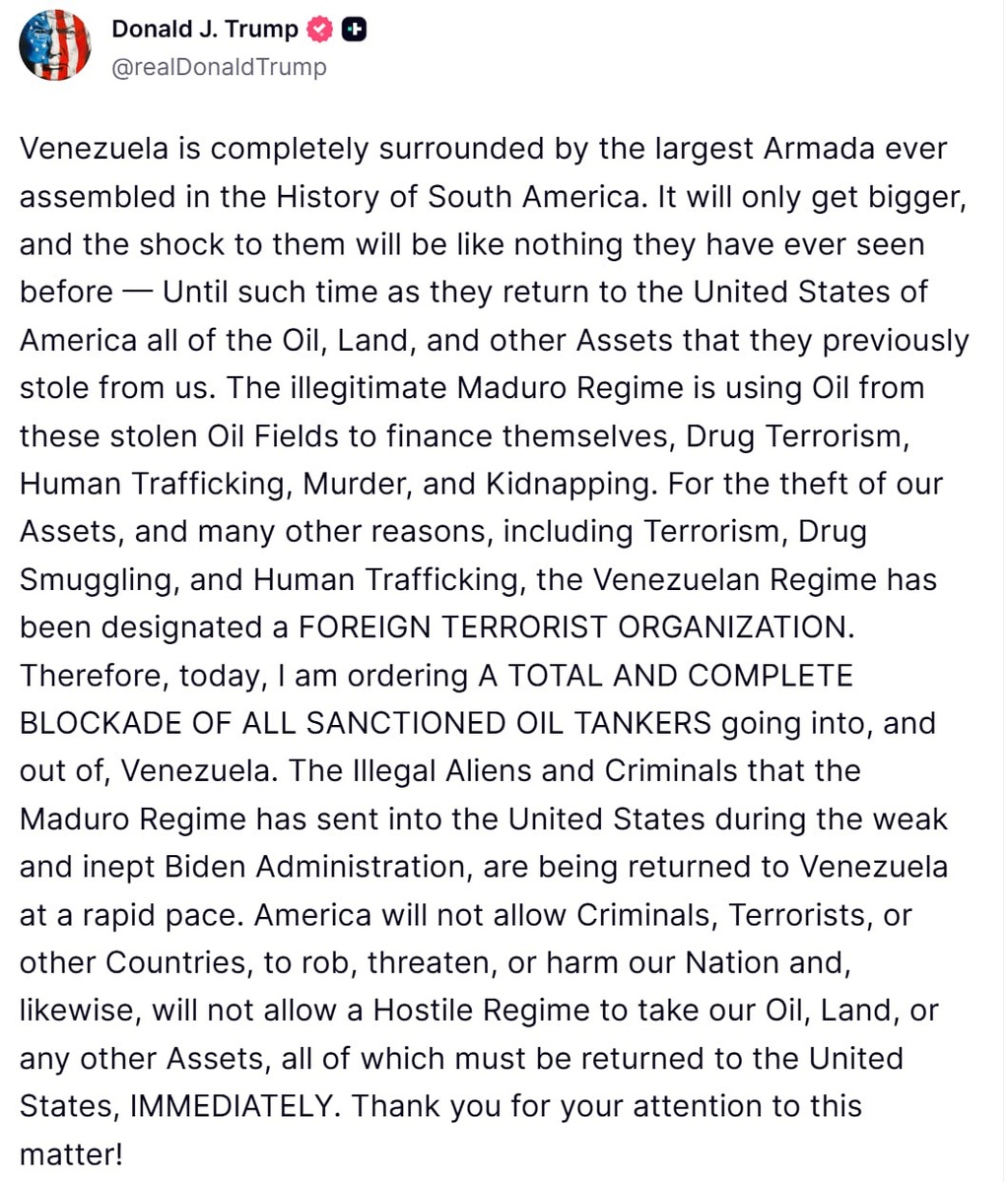 Она будет только расти, и потрясение для них будет таким, какого они никогда не испытывали, — до тех пор, пока они не вернут Соединённым Штатам Америки всю нефть, землю и другие активы, которые они ранее у нас украли. Нелегитимный режим Мадуро использует нефть с этих украденных месторождений для финансирования своей деятельности, наркотерроризма, торговли людьми, убийств и похищений. За кражу наших активов и по многим другим причинам, включая терроризм, контрабанду наркотиков и торговлю людьми, венесуэльский режим был признан ИНОСТРАННОЙ ТЕРРОРИСТИЧЕСКОЙ ОРГАНИЗАЦИЕЙ. Поэтому сегодня я приказываю ввести ПОЛНУЮ И ОКОНЧАТЕЛЬНУЮ БЛОКАДУ ВСЕХ ПОДПАДАЮЩИХ ПОД САНКЦИИ НЕФТЯНЫХ ТАНКЕРОВ, следующих в Венесуэлу и из неё. Нелегальные иммигранты и преступники, которых режим Мадуро отправил в Соединённые Штаты во время правления слабой и некомпетентной администрации Байдена, быстрыми темпами возвращаются в Венесуэлу. Америка не позволит преступникам, террористам или другим странам грабить, угрож