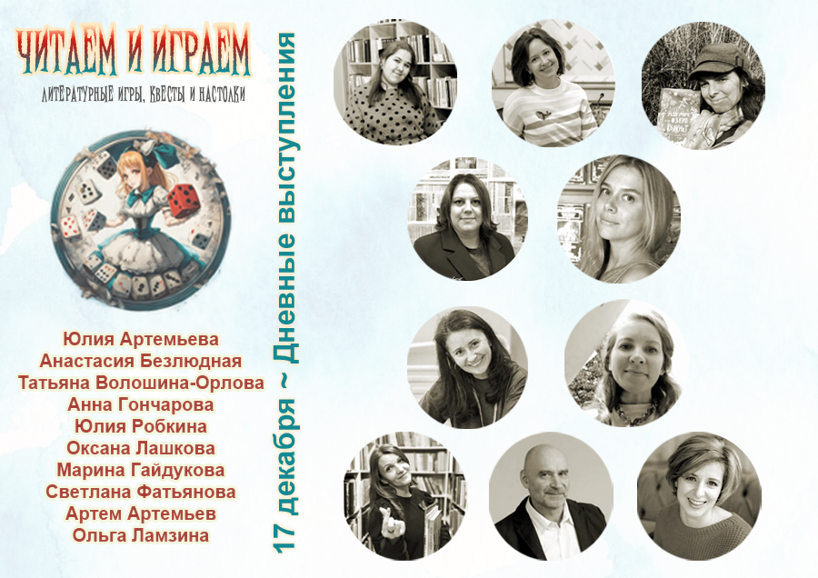 Расписание дневной программы конференции (время по мск) 10:00 - 10:20 Юлия Артемьева Город крылатого коня: взгляд искусственного интеллекта 10:20 - 10:40 Анастасия Безлюдная С книгой не соскучишься - вплетаем игру в чтение! 10:40 - 11:00 Татьяна Волошина-Орлова От чтения к проживанию: возраст, восприятие и качество литературной встречи 11:00 - 11:10 Обсуждение выступления спикеров 11:10 - 11:30 Анна Гончарова Игра как библиотечный стандарт: от настолки до архитектурного проекта. Опыт трансформации детской библиотеки 11:30 - 11:50 Юлия Робкина Этнотеатр теней "Чорчок": погружение в мир народной сказки через интерактивное библиотечное пространство 11:50 - 12:10 Оксана Лашкова Игровая палитра: как через игру открыть детям мир искусства 12:10 - 12:20 Обсуждение выступлен