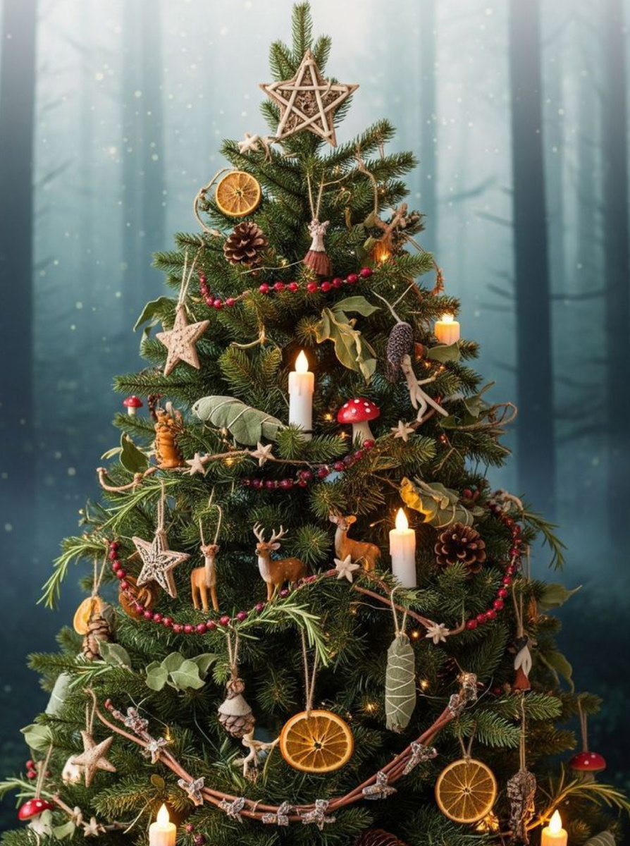 Использование натуральных материалов: Деревянные игрушки, шишки, сушеные фрукты и ягоды добавят вашей елке природной гармонии и тепла. Они также символизируют стабильность и прочность, что особенно важно в год Лошади.