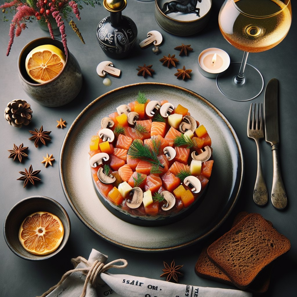 Тартар из лосося с северными грибами и крымским айвой