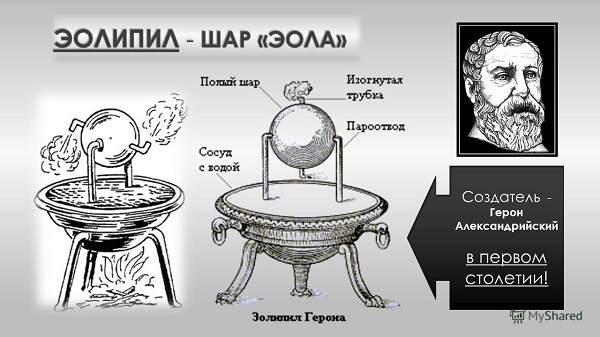50 год н.э. Герон Александрийский изобрёл первую паровую машину-полый металлический шар с трубками (эолипил (в переводе с греческого — «шар бога ветров Эола»)), из которых вырвался горячий пар и заставлял шар вращаться.