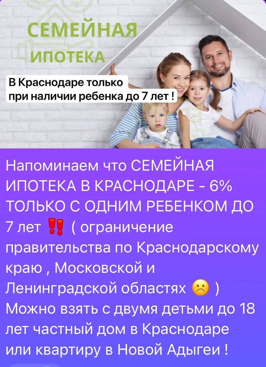 В Краснодарском крае , семейная ипотека -6% только при наличии ребенка до 7 лет или ребенка инвалида до 18 лет .