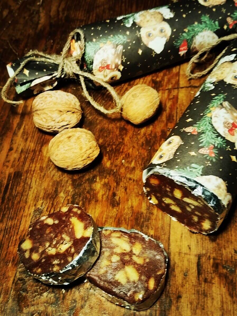 Молоко, какао,сахар,сливочное масло смешать в кастрюльке и поставить на маленький огонь и нагревать, размешивая, до получения однородной массы. Шоколадной смесью залить ту часть печенья , которая размолота в мелкую крошку, затем в эту массу уже насыпать печенья , поломанные на маленькие кусочки, чтобы не растворились кусочки печенья и выглядели как сало в колбасе " солями". Массу убрать в холодильник минимум на 2 часа. Состав: печенье 500г. , сливочное масло 180г., сахар 4 ст. л., 5 ст. л. какао-порошка , 200мл. молока, 1 ч.л. ванильного сахара.