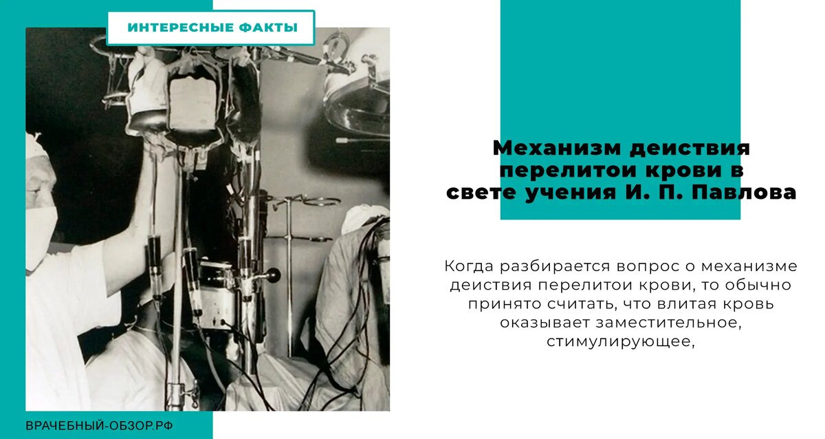 1952 год, «Вестник хирургии им. И.И. Грекова». Профессор Н. И. Блинов пытается объяснить действие перелитой крови «в свете учения Павлова» — и спорит с привычкой раскладывать трансфузию по отдельным полочкам: заместительное, гемостатическое, дезинтоксикационное… Его мысль проста и для своего времени смелая: организм отвечает на переливание сразу целиком. Не только «что влили», но и «как организм это воспринял» — через сосудистые рецепторы, центральную нервную систему и вегетативные механизмы. Отсюда — важность дозы и скорости: слабое раздражение поддерживает, сильное — может стать травмой. Почему это было неудобно Потому что это отнимало у врача удобное объяснение “чисто химией плазмы” и возвращало ответственность в клинику: техника, скорость, состояние реципиента и цена слишком резкого вмешательства. Что подтверждает и уточняет современность Сегодня мы понимаем механизмы точнее — но главный тезис Блинова (переливание = биологический сигнал, а не «нейтральная жидкость») неожиданно жив